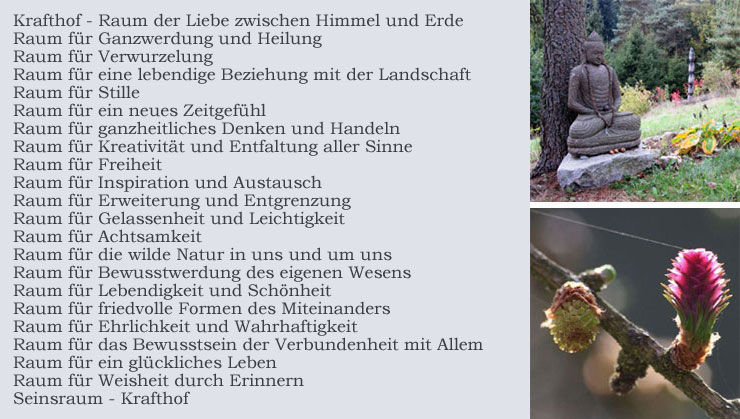 Das Besondere auf dem knapp 7 Hektar großen Gelände des Krafthofes ist die Vielfalt, nicht nur in optischer Hinsicht sondern auch in energetischer Hinsicht. Es gibt alten Mischwaldbestand mit kraftvollen Baumriesen und den verschiedensten Sträuchern an den Waldrändern, und Fichtendickichte, die nur langsam ausgedünnt werden können. Am Hang vor dem alten Haus und der Scheune liegt der Permakulturgarten mit seinen essbaren Wildpflanzen und Wildgemüse und vielen Beerensträuchern. Der Permakulturgarten geht über in die neu gepflanzte Streuobstwiese. Es gibt aber auch alte Obstbäume, die jährlich eine üppige Apfelernte einbringen. Überall im Gelände verteilt sind Sträucher mit Essbarem gepflanzt. Die Neupflanzungen wurden von Ritualen begleitet und bewusst harmonisch in die Landschaft eingebettet. Die vielen Schmetterlinge, Grillen, Vögel, Eidechsen und anderes Getier und auch die unterschiedlichsten Wildkräuter zeigen wie alles sich frei entfalten darf und in natürlichen Kreisläufen ineinandergreift. Oberhalb der Gebäude ist eine intensiv bewirtschaftete Ackerfläche, die ich an einen Biobauern verpachtet habe.